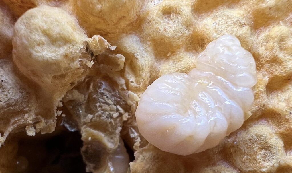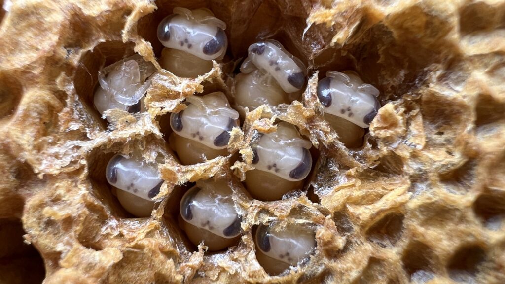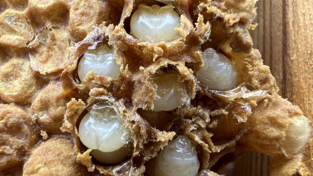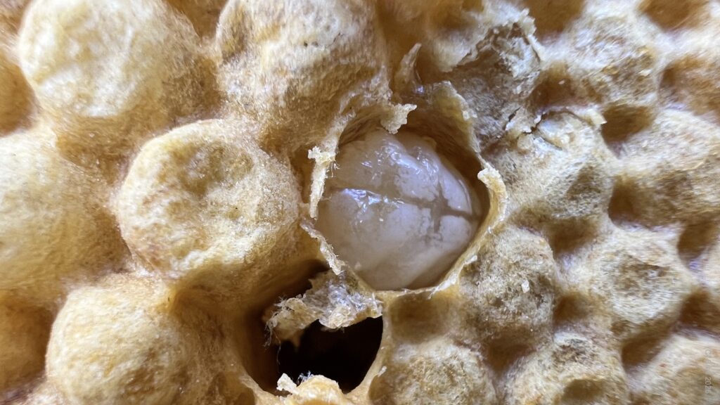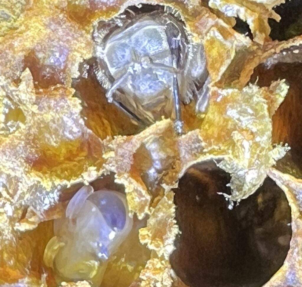 Abb. 1-4: Honigbienen Puppenzellen geöffnet. Man sieht zwei Puppen in verschiedenen Entwicklungsstadien. Fühler und Augen sind links unten schon angelegt. Rechts oben ist ein schon fast fertiges Insekt, die Härchen auf dem Thorax lassen sich erkennen. Rechts unten daneben ist ein Ei zu erkennen, die Königin war also vor kurzem auf dieser Wabe.