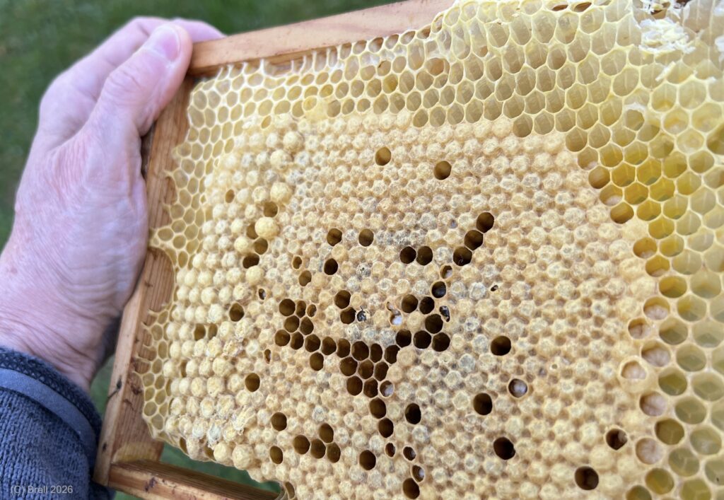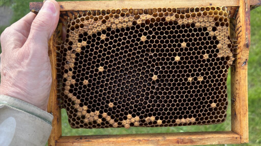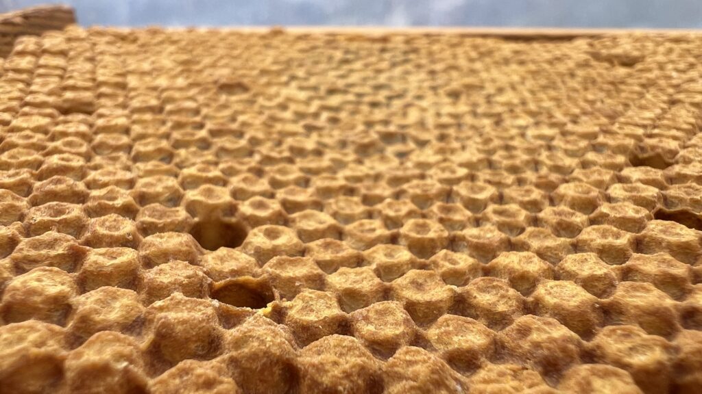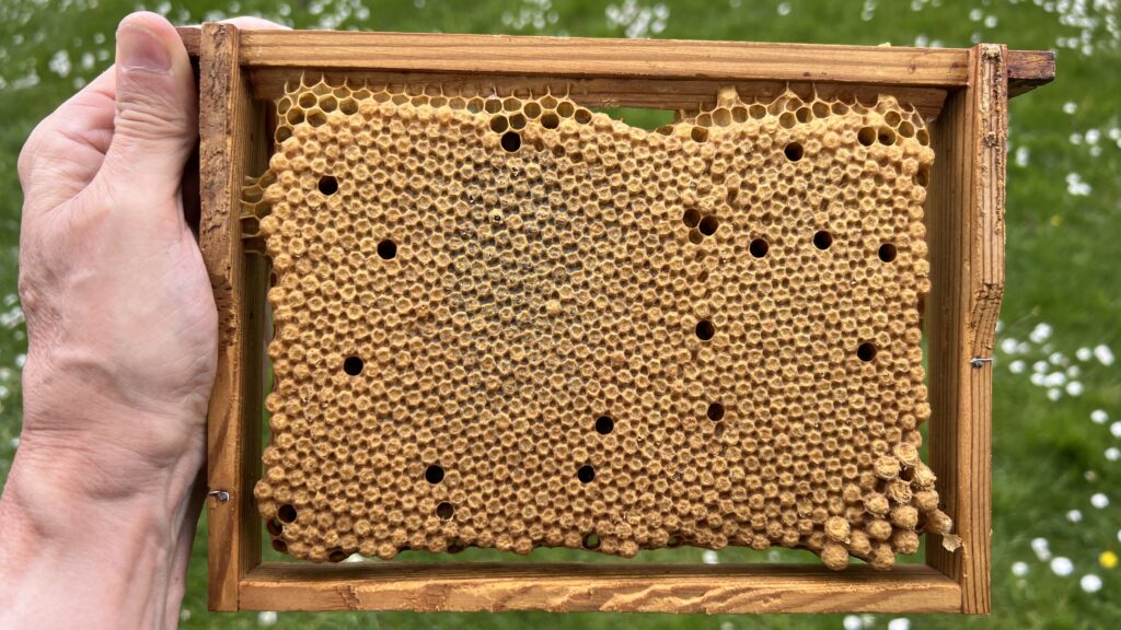 Abb. 1-8: Ein Drohnenrahmen, gegeben am 30.03. herausgenommen am 20.04. Dieses Volk hat noch nicht richtig Spaß an Drohnen und hat den Baurahmen mit Arbeiterinnenzellen ausgebaut. Auffällig sind die eingefallenen Zelldeckel. Meine Vermutung bislang ist, dass dies ein Ergebnis von Recapping ist. Das Volk hat in 7 Tagen einen Varroafall von Null, aber Anzeichen von VSH auf dem Varroaschieber.