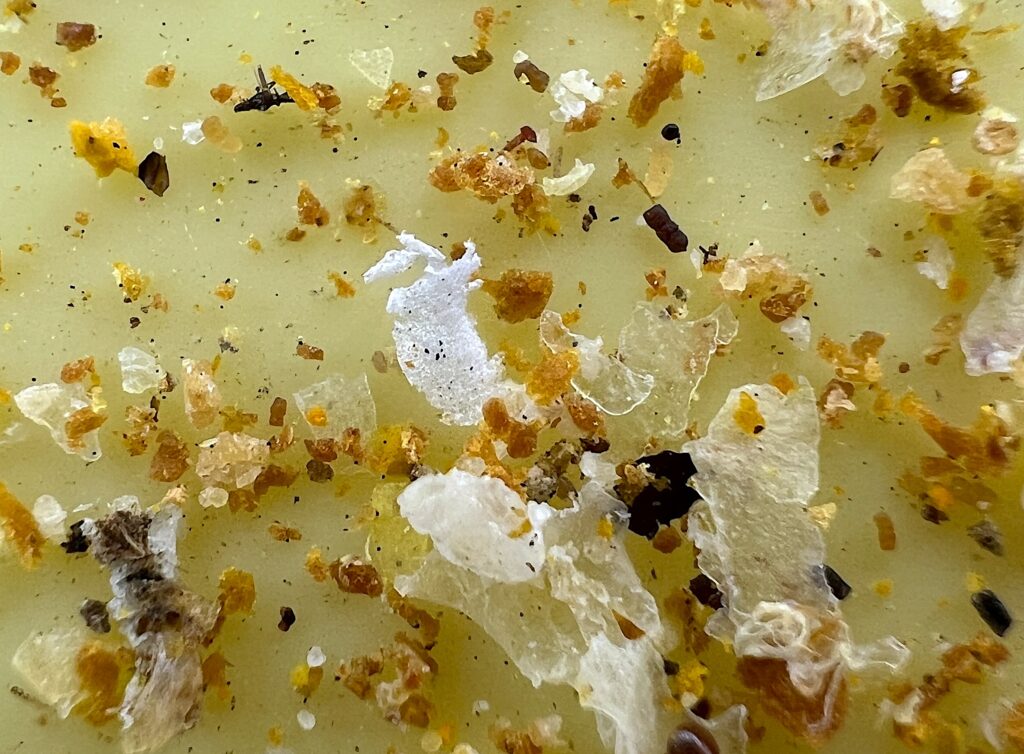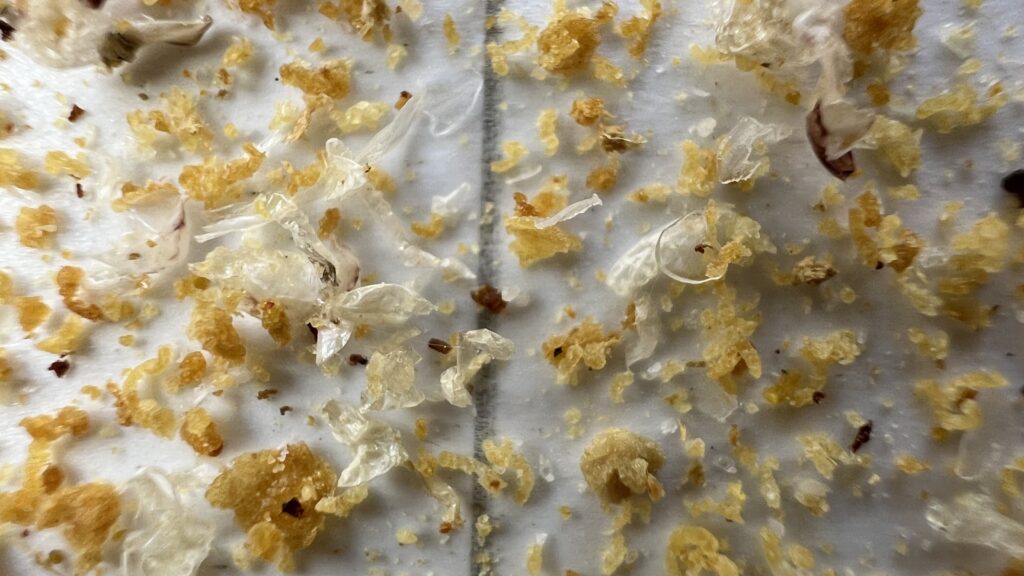 Abb. 2-1: Bodenschieber mit Wachsschüppchen und Larvern-Skelett. Zu sehen sind kleine braune Wachsschrot-Stücke, das sind die Deckel von geschlüpften Honigbienen. Dazwischen liegen durchsichtige frische Wachsschüppchen. In der Mitte, weiß und fast „wolkig“, ist ein Skelett einer ausgeräumten Larve zu erkenne. Das könnte ein Hinweis auf ein VSH Verhalten der Bienen sein.