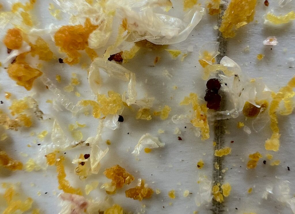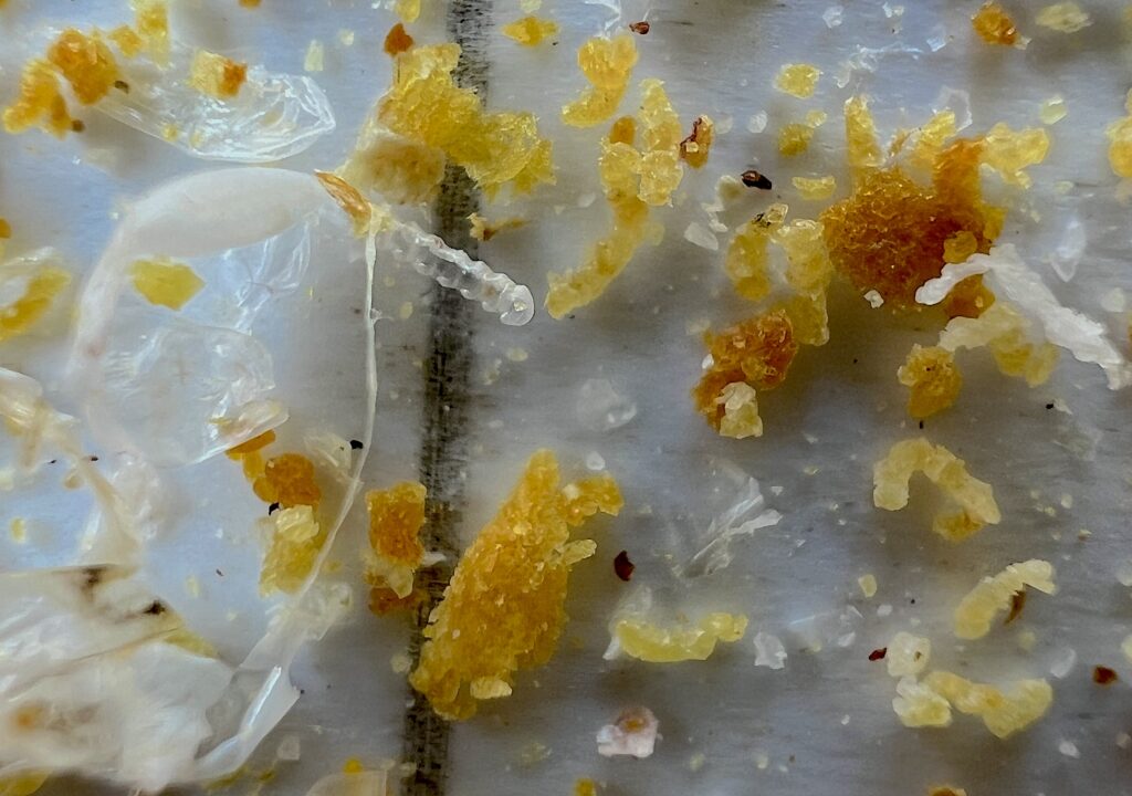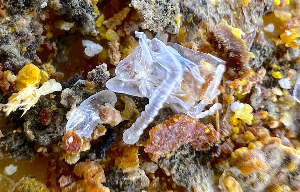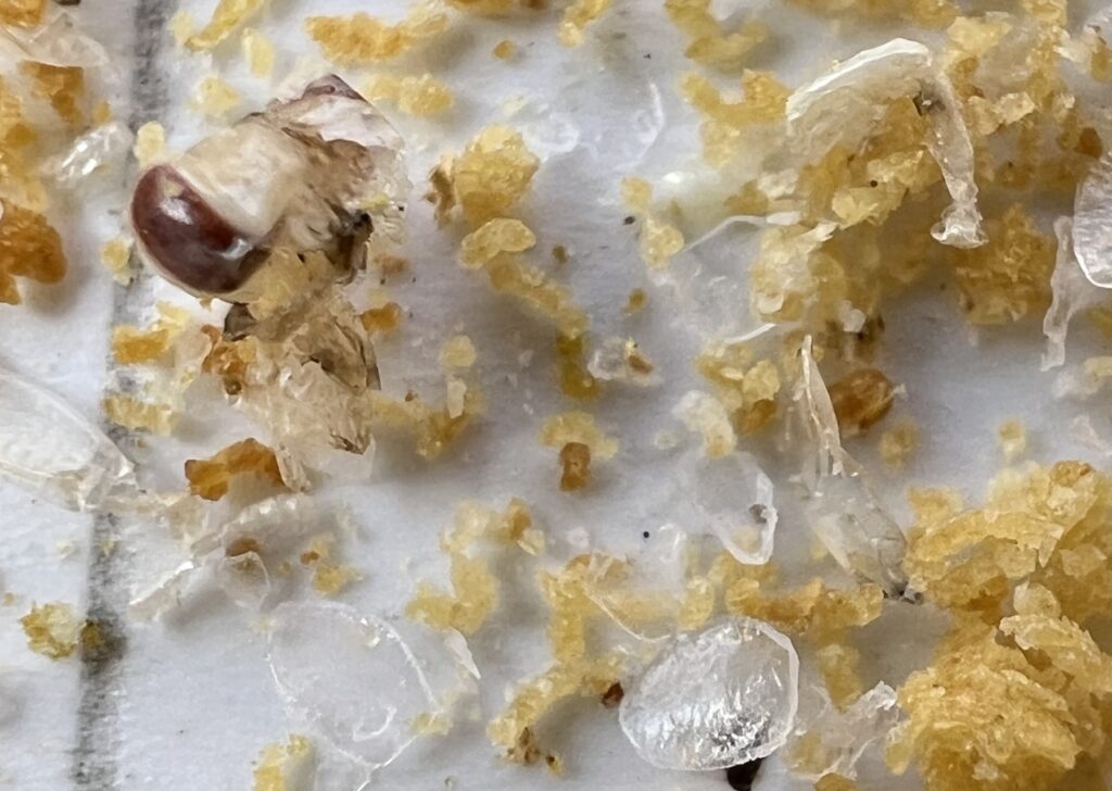 Abb. 2-2: Ein seltsames Organteil auf dem Bodenschieber neben Pollen und geschroteten Zelldeckeln. Die Vermutung, dass es sich um Bienen-Larvenfühler handelt, wurde zunächst bei Imkertreffen kontrovers diskutiert. Eine vertiefte Recherche brachte dann Bilder von Puppen zutage, deren Fühler so aussehen. Scheinbar handelt es sich um solche in einem frühen Stadium der Entwicklung. Somit könnten solche Objekte auf dem Bodenschieber auch auf ein Ausräumverhalten / VSH hindeuten.