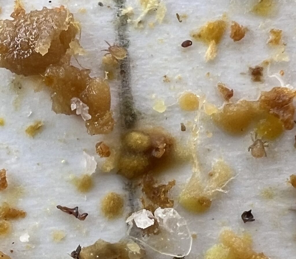 Abb. 2.2-1: Zwei Pollennmilben.(externes Bild auf Insekts.ch). Pollenmilben sind kleiner als 0,5 mm und mit dem Auge und einem guten Smartphone gerade noch zu entdecken. Pollenmilben ernähren sich von Pollen, verbrauchen sehr wenig und sind für Honigbienen völlig harmlos. Sie treten bei mir in sehr starken und gesunden Völkern auf, die schon länger keine Varroa-Medikamente gesehen haben. Pollenmilben bevorzugen feuchte Umgebungen. Ich beobachte sie daher eher an brütenden Völkern. Weitere Kommentaren im Bienenstock finden man im Beitrag Bienenstockleben – Artenvielfalt in halben Millimetern