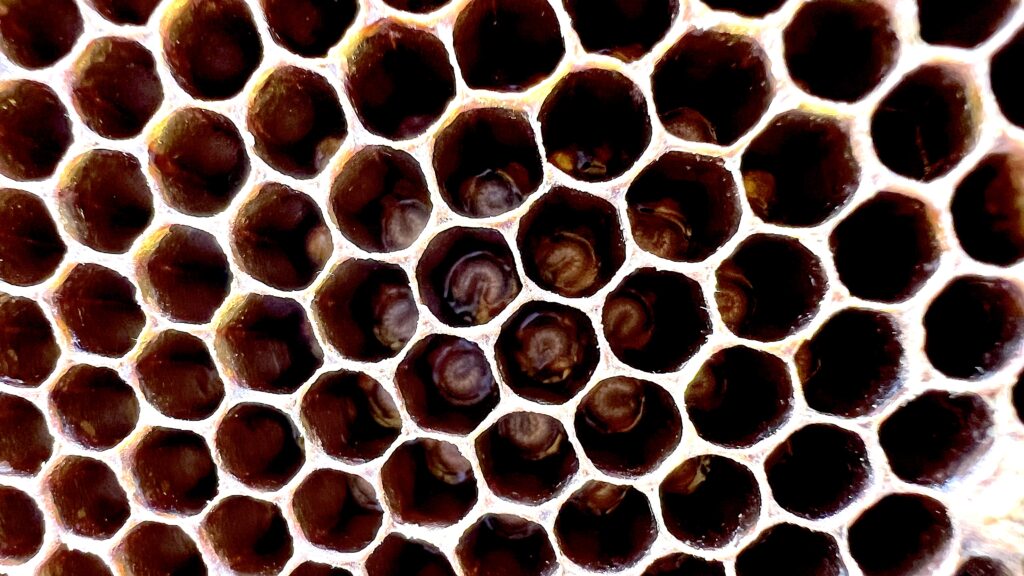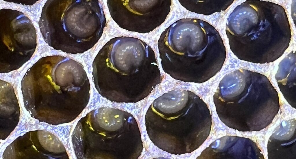 Abb. 1-3: Eine Nahaufnahme einer mehrfach bebrüteten Wabe, die zunächst leer schien. Seitlich wurde hier mit einer Taschenlampe beleuchtet, so dass sich die glänzenden Larven vom dunklen Zellhintergrund abheben.