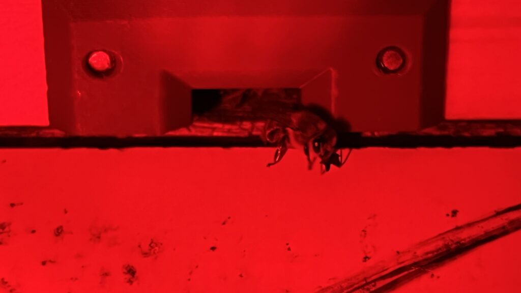 Abb. 5: Nachtaufnahme mit Rotlicht. Die Bienen halten auch im Dunkeln Wache am Flugloch – niemand darf hinein.