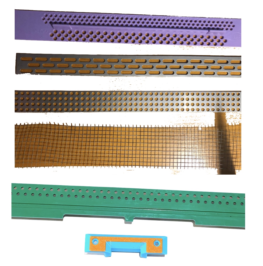 Abb. 1: Einige von den Imkereibedarfsfirmen angebotene Hilfsmittel zur Fluglocheinengung. Einige sind umbenannte Mäusegitter und zu groß. Andere streifen den Pollen an. Das grüne Nicot Gitter (eigentlich ein Mäuseschutz) funktioniert bei großen Velutina, kleine kommen allerdings nachweislich hindurch. Der blaue Fluglocheinsatz (unten) ist eine Fluglocheinengung zur Erstellung eines Fluglochkeils und eine Neuentwicklung von clabremo, derzeit im Test und wird auf der eurobee 2025 vorgestellt.