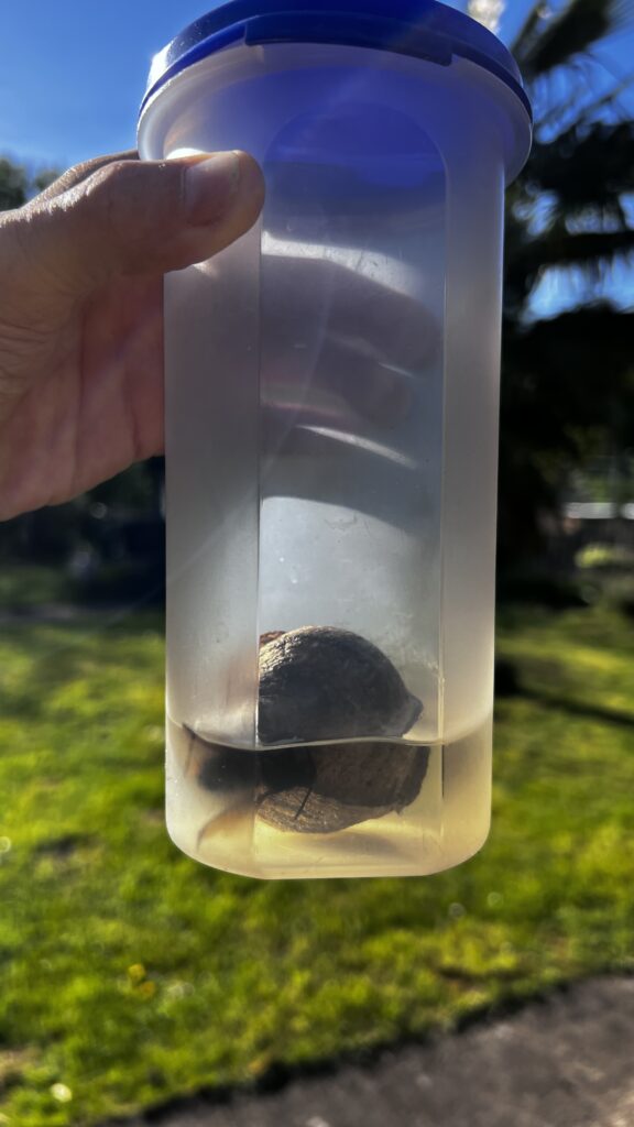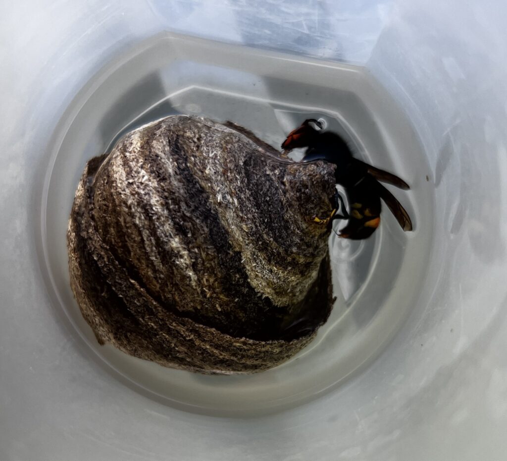 Abb. : Die Haushaltsdose mit Brennspiritus und der gefangenen Königin der Asiatischen Hornisse. Das Nest musste gleich mit abgenommen werden.