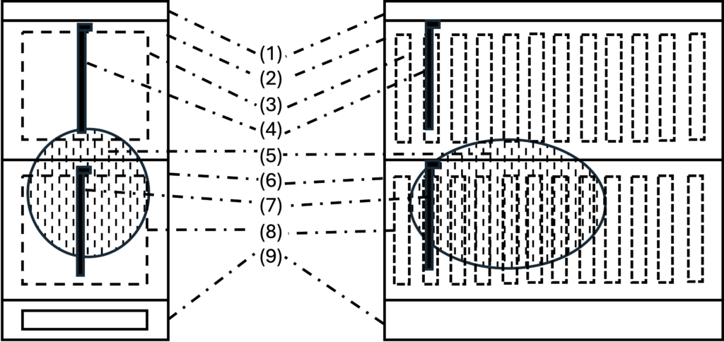 Abb. 1: Die Positionierung der Temperatursensoren im Bienenstock. Schematisch dargestellt ist eine zweizargige Beute links in Front- und rechts in Seitenansicht. Es bedeuten: (1) Beutendeckel (2) Zarge mit Futterwaben (3) Futterwabe (4) Temperatursensor auf einer Futterwabe,  (5) Bienensitz, Wintertraube, (6) Brutzarge (7) Temperatursensor auf einer Brutwabe (8) Brutwabe  (9) Beutenboden