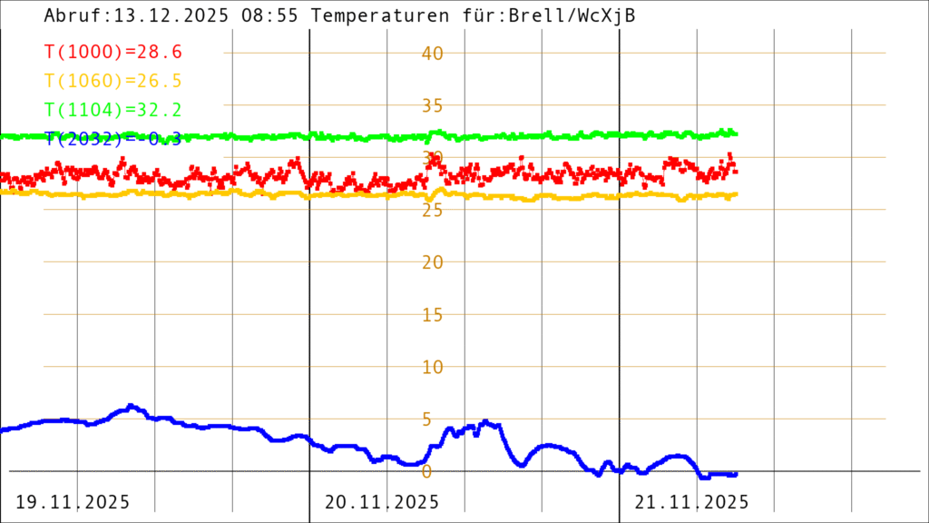 Abb. 2: Verlauf der Außentemperatur (blaue Kurve) im November. Dargestellt sind drei ganze Tage, also 72 Stunden. Zu sehen ist, dass die Temperatur nachts auf unter 0°C fällt. Die Temperaturen in der Mitte der Wabe (orange) und am Oberträger (grün) sind relativ konstant. Das deutet darauf hin, dass die Bienen in der Nähe des Sensors noch brüten. Durch zwei kühle Nächte am 20.11.2025 und am 21.11.2025 kann nach 21 Tagen so ab dem 11. Dezember mit nahezu Brutfreiheit gerechnet werden.