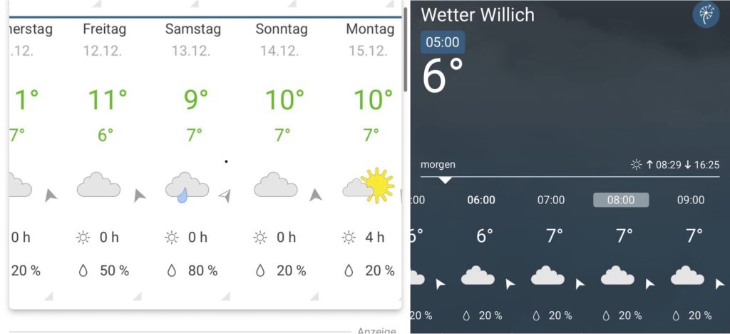 Abb. 5: Wetterprognose für den nächsten Tag. Wetterprognosen für die nächsten 24 Stunden haben i.d.R. eine Eintreffensquote von bis zu 95%, können also als verlässlich angenommen werden. Die Vorhersage in der Abbildung weist für den kommenden Tag (12.12.2025) eine minimale Temperatur von 6°C und teilweise trockenes Wetter aus. Details der Prognose zeigen eine Temperatur von 7°C zum Zeitpunkt des Sonnenaufgangs. Damit kann in der Frühe mit Oxalsäure geträufelt werden. Bei wärmeren Temperaturen wäre Bedampfen das Verfahren der Wahl.