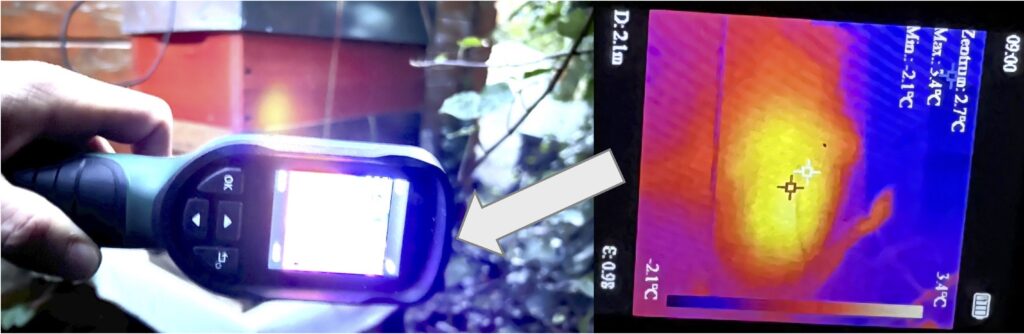 In der Tat war die Temperatur am Freitag 12.12.2025 am Bienenstock mit 6,4°C zum Zeitpunkt des Sonnenaufgang niedrig. Eine Thermografieaufnahme durch die Seitenwand der Beute (Abb. 6) am Morgen zeigt den engen Bienensitz wie erwartet. Die Bienen saßen zusammen in der unteren Zarge, eine Träufelbehandlung konnte durchgeführt werden.
