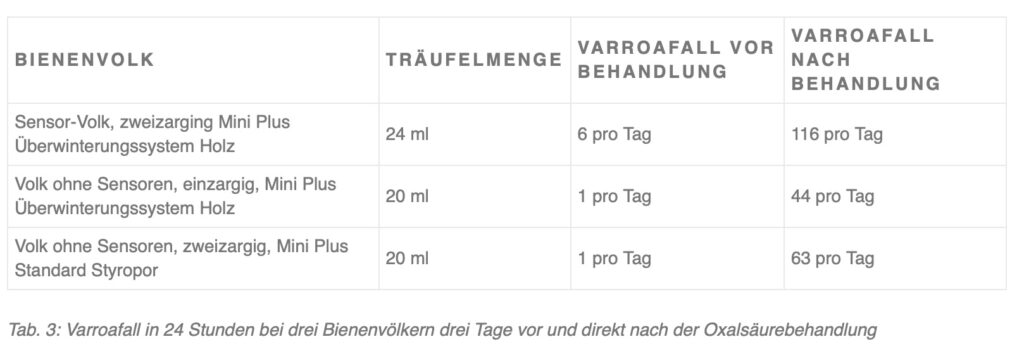 Eine Kontrolle des Varroafalls (Tab. 1) dieser und zwei weiteren Bienenvölker, die zeitgleich behandelt wurden, zeigt den Erfolg der Oxalsäure-Träufelbehandlung.